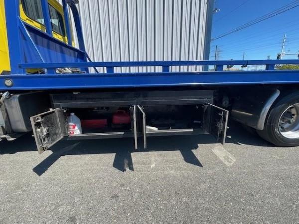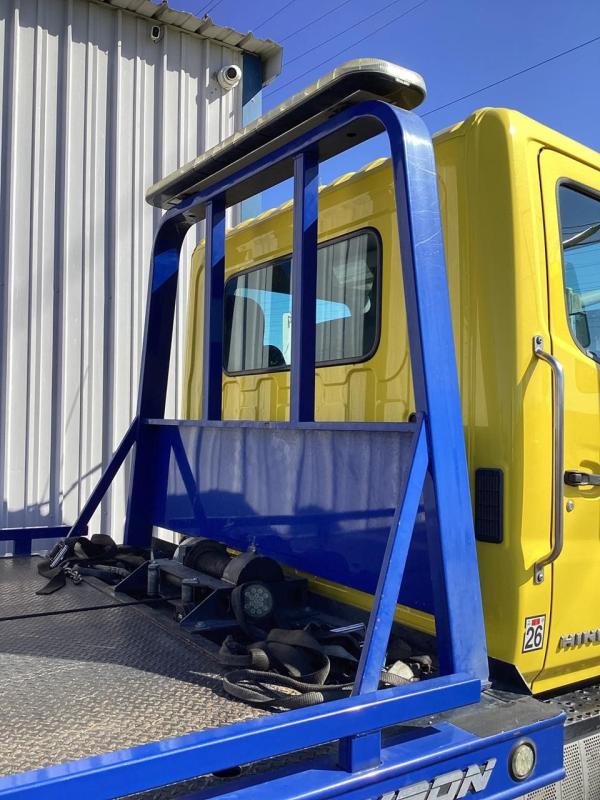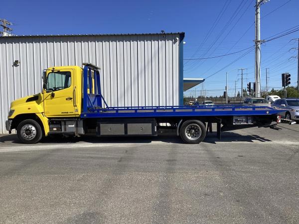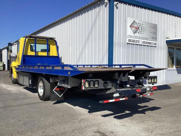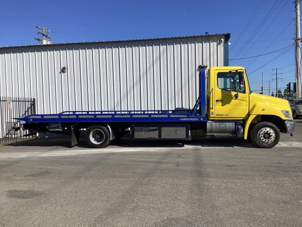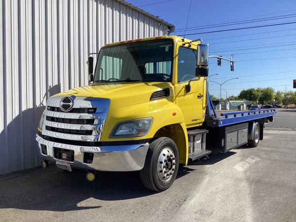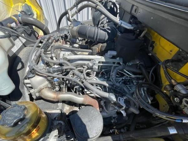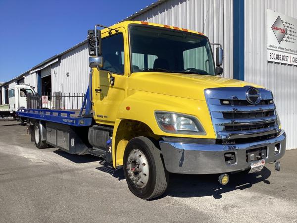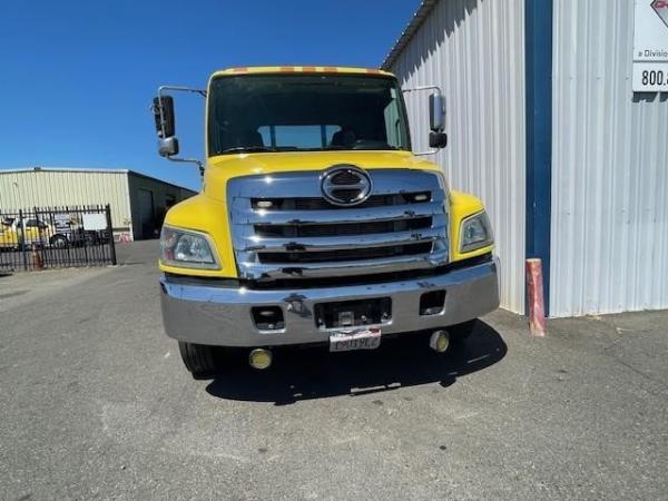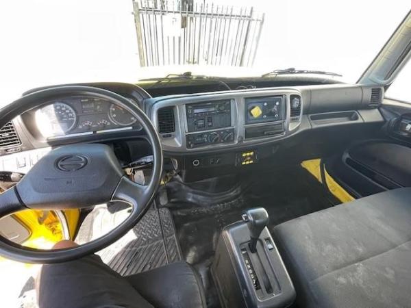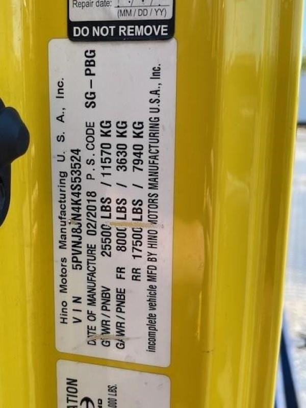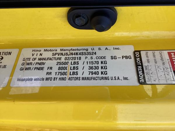 2019 Hino Model 258 260HP J08E-AT 6 Cylinder turbo Diesel 660lbs torque. Allison 2200 RDS Transmission with park. Power Windows. Power locks. Cruise Control. AM/FM CD player, 19.5 245/70R tires. Tilt Telescoping steering wheel. Suspension seat Driver (Fabric cover), Two-man passenger (Fabric cover). Air Brake package. Chrome Grille. Chrome Mirrors- Heated Mirrors. Power windows. Power locks. Chrome bumper. Exhaust brake. Heated mirrors. 52-gallon Aluminum fuel tank. 8,000lb front axle. 17,500lb Rear Axle. 4.11 Rear End Ratio. 19,000lb Hendrickson Air Suspension w/dump valve. Daytime Running lights. Block heater, Aluminum wheels. 19.5 x 7.25. .. EPA 10 Compliant SCR. Cold weather package. Driver Information Display LCD. GVWR 25,500. Connected Vehicle, Telematics,Inspection Level 1 Report: Front tire depths: 14/32 15/32 10/32 13/32 11/32 11/32 Brakes 18/32 18/32 18/32 -1(18/32) has wheel seal leak- To be repaired. Rear license plate light inop, Rear shocks leak, Pass side Mirror missing cover.