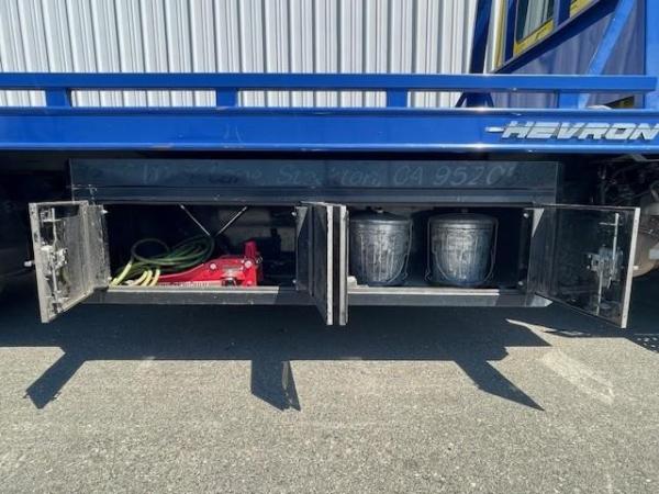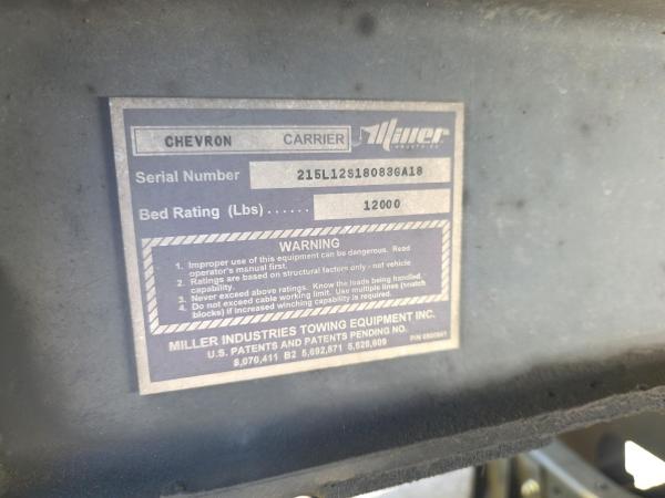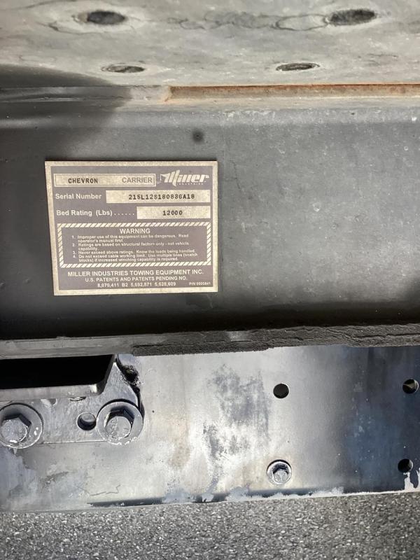 Chevron 21.5' Steel LCG (Low Center of Gravity) Carrier w/ Wheel Lift, 3/16 Deck Plate, 3x2 Corten Tube Crossmembers on 8 inch Centers, (4) Rear Chain Locks, (2) Front Chain Locks, (6) Floor Plate Chain Locks (3 per side), 8,000lb Worm Gear Winch, 3/8" x 50' Winch Cable, Illuminated Dual Controls, FMVSS 108 Lamp Group Shock Mounted Lighted, Direct Mount Pump, Cable Roller Guide w/ Tensioner, Winch Free Spool Extension, Back-Up Alarm, (2) Safety Chains, Mechanical Anti-tilt, Black Body Paint, 102" Wide Body, Inboard Tilt Cylinders, Floor Level Roll Formed w/ Punched Stake Pockets, 4,000lb Wheel Lift w/ Releasable L Arms, Fully Hydraulic Wheel Lift, (2) Safety Straps & Ratchets, (2) Rear Safety Chains, Body Lock w/ Nylatron Toller Bearings, & 12,000lb Deck Load Rating. Serial# 2215L12S18083GA18