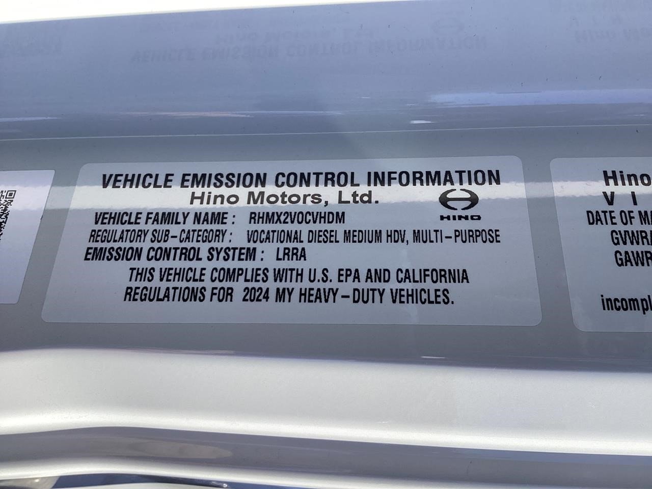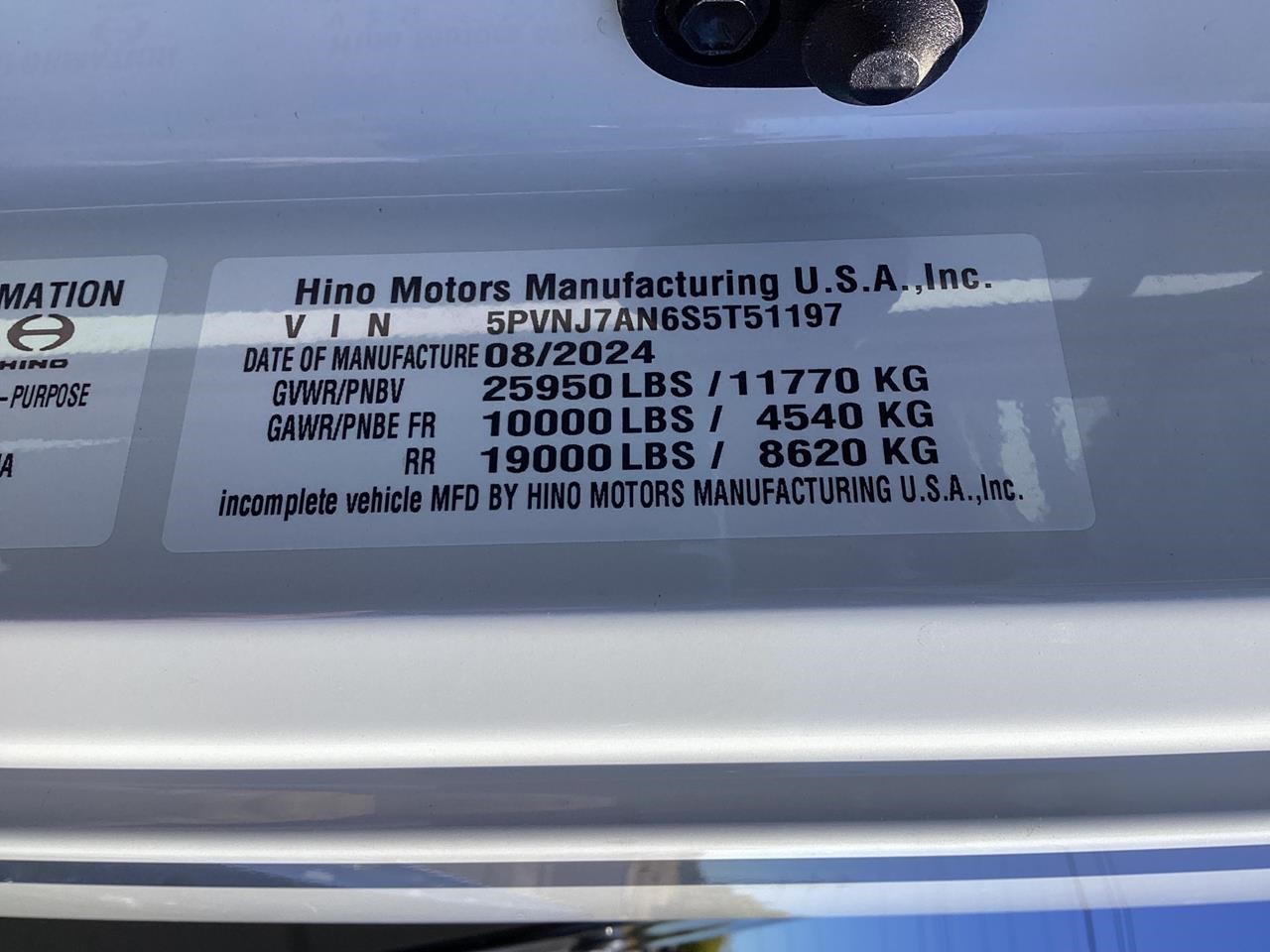 2025 Hino L-6 California Compliant - 260 HP Auto. Allison Automatic. Exhaust Brake, Air Brake package. 10,000lb front Axle 12K Front Suspension. 19,000lb Rear Axle, 4.88 Ratio. 52 52-gallon aluminum tank. 19,000lb Air suspension. Power Group, AM/FM Bluetooth, air-ride driver's seat. Two-man passenger seat. cruise control, Idle up, chrome bumper -Aluminum wheels, Power Mirrors. Tilt wheel.. WB 22.5 25570R Tires. GVWR 25,950 149” CA ---- 5-year 300K Engine and After-treatment. 7-year unlimited -Allison Warranty