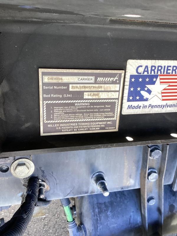 Chevron 21.6' Steel LCG (Low Center of Gravity) Carrier w/ Wheel Lift, 3/16 Deck Plate, 3x2 Corten Tube Crossmembers on 8 inch Centers, (4) Rear Chain Locks, (2) Front Chain Locks, (6) Floor Plate Chain Locks (3 per side), 8,000lb Worm Gear Winch, 3/8" x 50' Winch Cable, Illuminated Dual Controls, FMVSS 108 Lamp Group Shock Mounted Lighted, Direct Mount Pump, Cable Roller Guide w/ Tensioner, Winch Free Spool Extension, Back-Up Alarm, (2) Safety Chains, Mechanical Anti-tilt, Black Body Paint, 102" Wide Body, Inboard Tilt Cylinders, Floor Level Roll Formed w/ Punched Stake Pockets, 4,000lb Wheel Lift w/ Releasable L Arms, Fully Hydraulic Wheel Lift, (2) Safety Straps & Ratchets, (2) Rear Safety Chains, Body Lock w/ Nylatron Roller Bearings, & 12,000lb Deck Load Rating. Body Serial# 215L12S00579HJ16