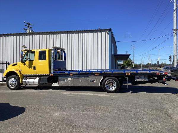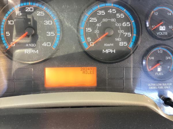 260 HP Cummins EATON Procision 7 Speed Automatic. 50-gallon Aluminum Fuel tank. Air brake package. Air dryer. Exhaust Brake. 18,000lb Airliner Suspension with Dump Valve. Chrome Bumper. Air ride Driver seat. Single passenger Seat. Rear Bench Seat. Tilt Wheel. Idle up, Cruise control. AM/FM CD player with 4 Speakers. 6-position Switch panel. 8,000lb Front axle. 19,000lb Rear axle. 22.5 255/70R Tires. Aluminum Wheels. Visor, Air Ride Cab. 25,500 GVInspection notes: Front 11/32 11/32 Rear Tires 17/32 all. Brakes 30% & 40%. Needs Windshield, cracked, body Roller locks bent, needs adjustment.