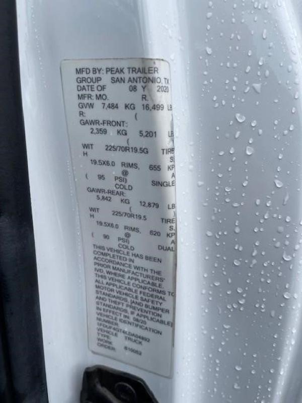 2020 Ford 450 XLT 475HP 1050 Torque. 6.7L Diesel. Torque Shift 10 Speed Automatic. Power windows, power locks. Idle up, Cruise. Vinyl - 40/20/40 Split Bench seat. Aluminum wheels. 225/70R 19.5 Tires. AM/FM w/Mp player. Keyless Entry. Block heater. 26.5-gallon Fuel tank. Platform running boards. Rear View Camera. Upffitter switches. low deflection package. PTO Provision- 16,000lb GVWR, limited slip ratio 4.10. Engine block,810 Vulcan -