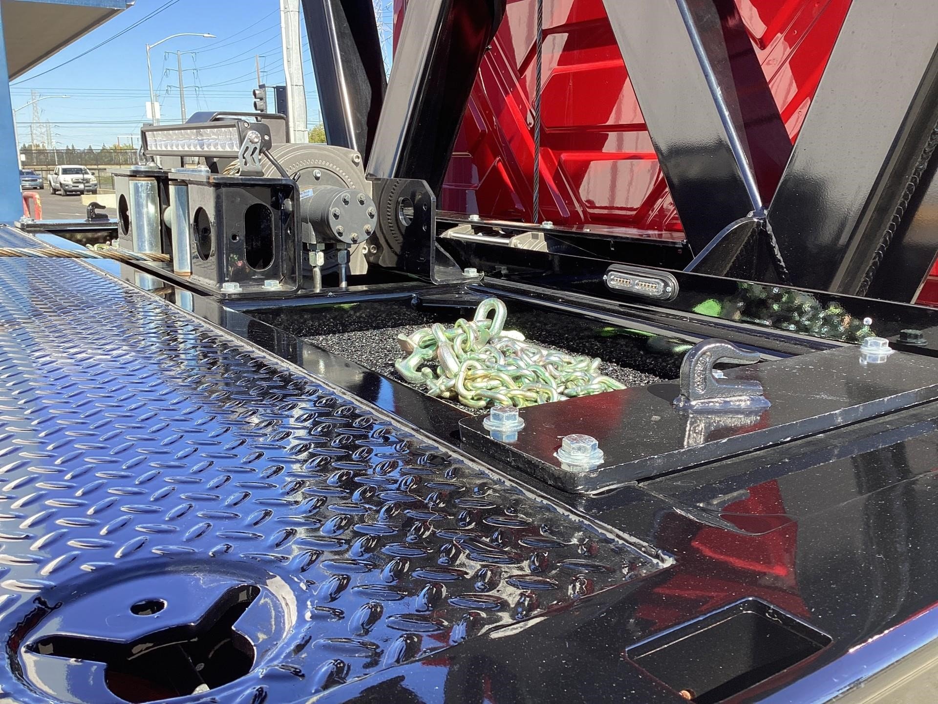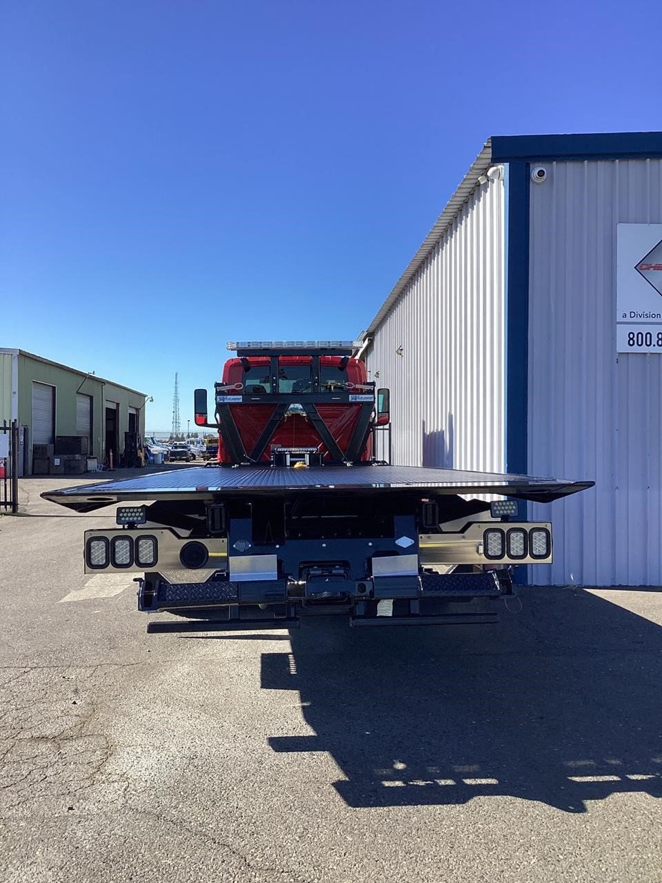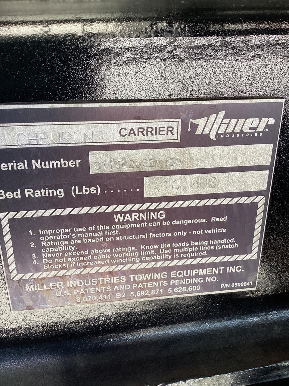 Chevron Steel LCG 16,000lb (Low Center of Gravity) Carrier w/ Wheel Lift, 3/16 Deck Plate, 3x2 Corten Tube Crossmembers on 8 inch Centers, (4) Rear Chain Locks, (2) Front Chain Locks, (6) Floor Plate Chain Locks (3 per side), 8,000lb Worm Gear Winch, 3/8" x 50' Winch Cable, Illuminated Dual Controls, FMVSS 108 Lamp Group Shock Mounted Lighted, Direct Mount Pump, Cable Roller Guide w/ Tensioner, Winch Free Spool Extension, Back-Up Alarm, (2) Safety Chains, Mechanical Anti-tilt, Black Body Paint, 102" Wide Body, Inboard Tilt Cylinders, Floor Level Roll Formed w/ Punched Stake Pockets, 4,000lb Wheel Lift w/ Releasable L Arms, Fully Hydraulic Wheel Lift, (2) Safety Straps & Ratchets, (2) Rear Safety Chains, Body Lock w/ Nylatron Toller Bearings, & 12,000lb Deck Load Rating. Body SN# ST16L2G224350
