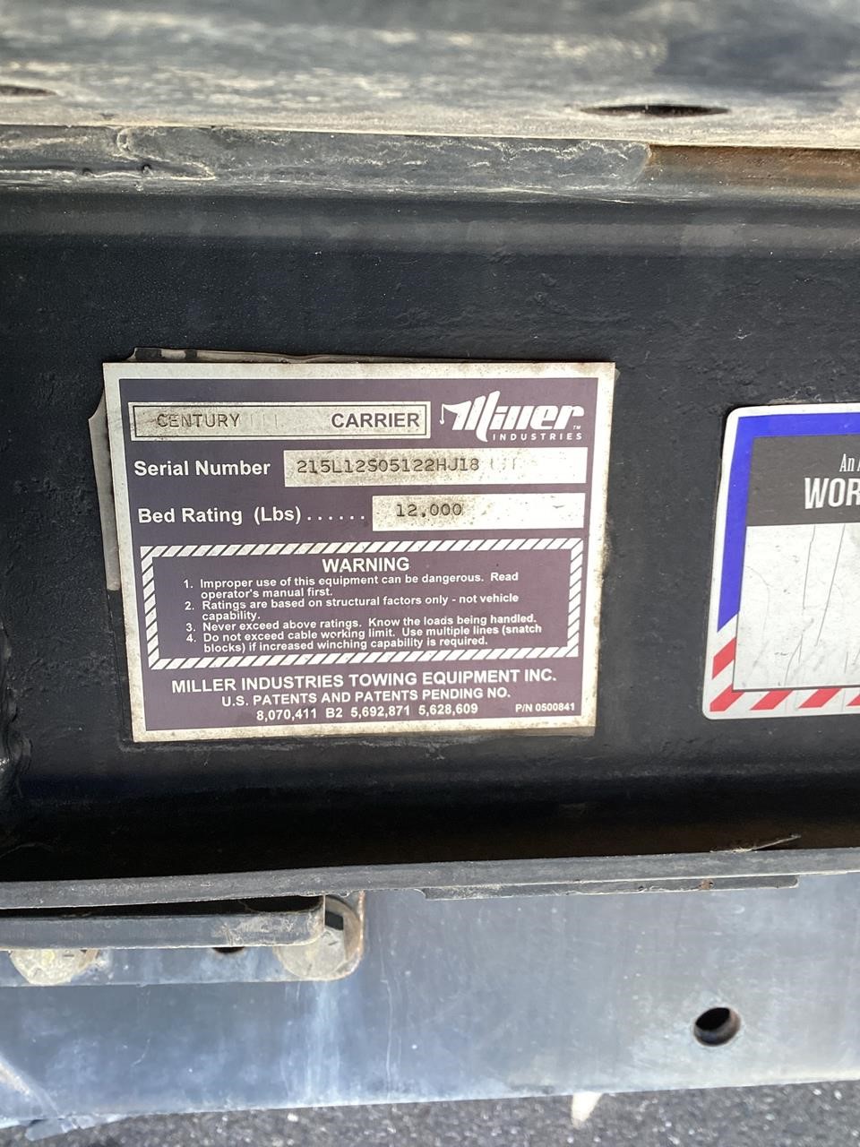 Century Steel LCG (Low Center of Gravity) Carrier w/ Wheel Lift, 3/16 Deck Plate, 3x2 Corten Tube Crossmembers on 8 inch Centers, (4) Rear Chain Locks, (2) Front Chain Locks, (6) Floor Plate Chain Locks (3 per side), 8,000lb Worm Gear Winch, 3/8" x 50' Winch Cable, Illuminated Dual Controls, FMVSS 108 Lamp Group Shock Mounted Lighted, Direct Mount Pump, Cable Roller Guide w/ Tensioner, Winch Free Spool Extension, Back-Up Alarm, (2) Safety Chains, Mechanical Anti-tilt, Black Body Paint, 102" Wide Body, Inboard Tilt Cylinders, Floor Level Roll Formed w/ Punched Stake Pockets, 4,000lb Wheel Lift w/ Releasable L Arms, Fully Hydraulic Wheel Lift, (2) Safety Straps & Ratchets, (2) Rear Safety Chains, Body Lock w/ Nylatron Toller Bearings, & 12,000lb Deck Load Rating. Body SN# ST12L2J254230