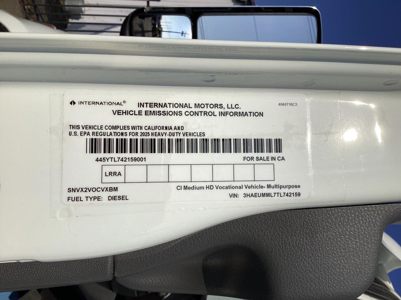 International Model MV Extended cab. Cummins ISB 6.7L, 300HP @ 2,300 rpm, 660 lb-ft @ 1,600 rpm, Allison RDS-2200 6 Speed Auto, Air Brakes, Air Dryer Heater, Exhaust Brake, Front Axle: Dana-Spicer I-Beam 8,000lb w/ Shock Absorbers, Rear Axle: Dana-Spicer 19,000lb rear differential lock. , 20,000lb Air Ride Suspension, 4.88 Rear Axle Ratio, Chrome Bumper, black Grille, Air Ride Driver Seat,& Passenger Seat, rear bench seat. Idle Up, Cruise Control, Tilt-Wheel, AM/FM/CD/MP3 w/ Bluetooth, Air Horn, Engine Block Heater, Dual 40-50 Gal Alum Fuel Tanks, 7 Gal DEF Tank, Power Windows, Power Door Locks, Power heated Mirrors. A/C, 255/70R22.5 Tires w/ 22.5 Alum Wheels, Cup holders.Visor 25,500 GVWR,