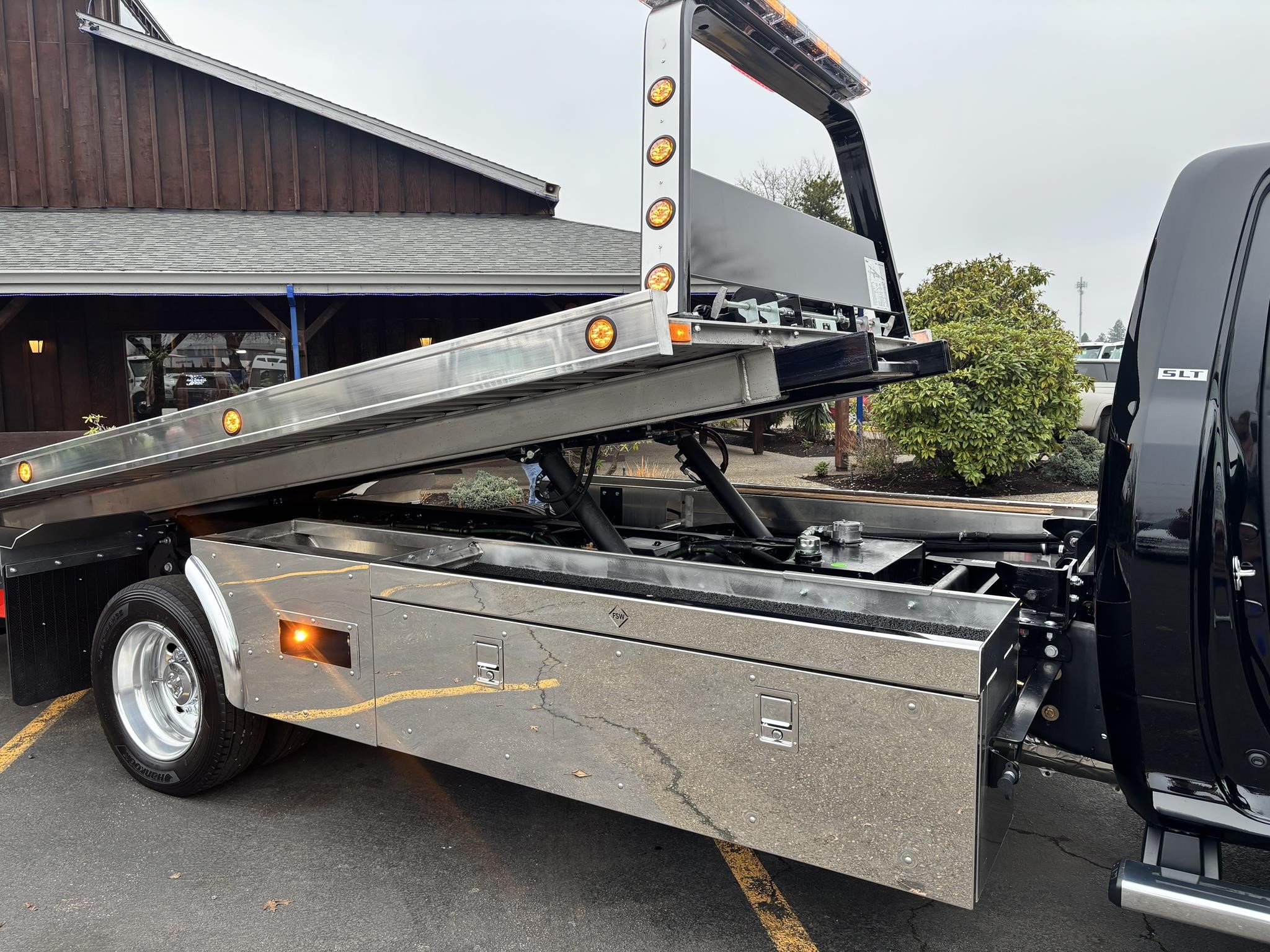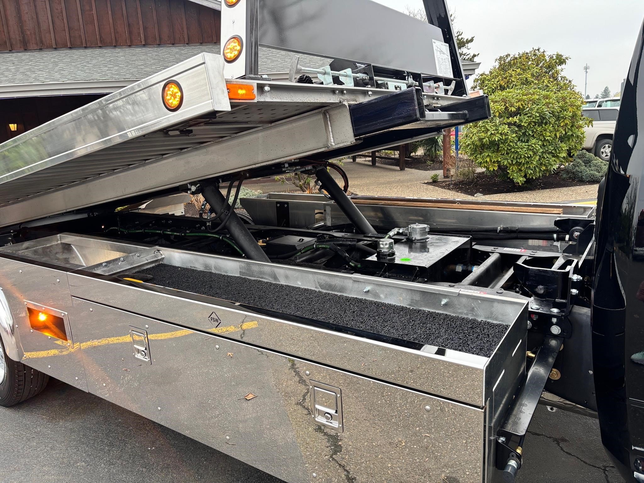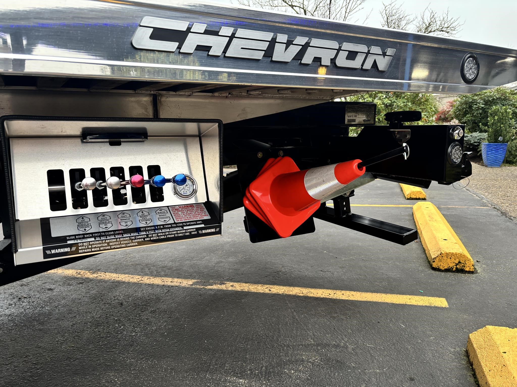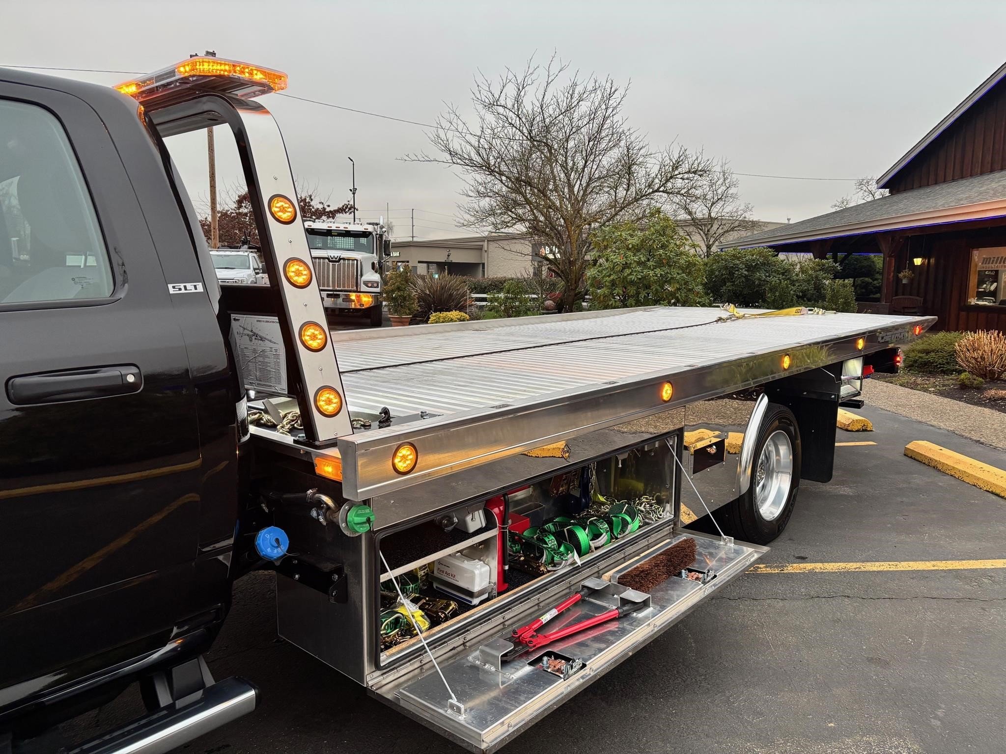Chevron G-219.6" Aluminum Floor Rails (Aluminum) 4 Key Slot Package (Aluminum) 210" Full-Length Subframe Full-Length Slide Pads Right & Left Chain Trays Bed Anti-Tilt Lockout. Safety Chains (2-front, 2-rear) Positive Lock-down Painted with Black Acrylic Enamel (Subframe). Two Lift Cylinders Left & Right Side Illuminated Controls One Extension Cylinder Federal Standard #108 LED Lighting Winch Clutch Release 8,000 lb. Hydraulic Winch w/50' Cable Cable Tensioner Full Function Wheel Lift System Cable Roller Guide Slide-In L-Arms with Anti-Theft Storage Tow Light Socket. Pre-Wired Electrical Junction Box Mud Flaps Back-Up Lights & Alarm Hydraulic Pump. Adjustable Rear Stabilizer. LED Light package included. Body SERIAL# AL10C2B230967